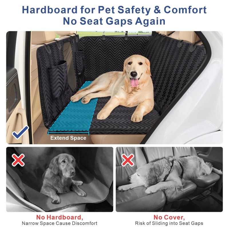 No-Slip Safety for Peace of Mind: The thick sponge and hardboard create a snug, stable spot for your dog; Back seat extender for dogs with embossed fabric and rubber grips keep them secure even during sudden brakes or sharp turns so you can drive worry-free