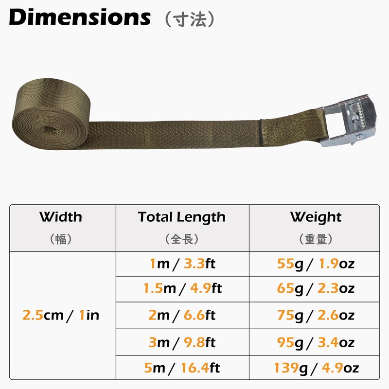 - Specifications: Material: Belt: Nylon, Cam Buckle: Zinc Alloy, Width: 1.0 inches (25 mm), Length: 6.6 ft (2 m), 9.8 ft (3 m), 16.4 ft (5 m), Set of 4
