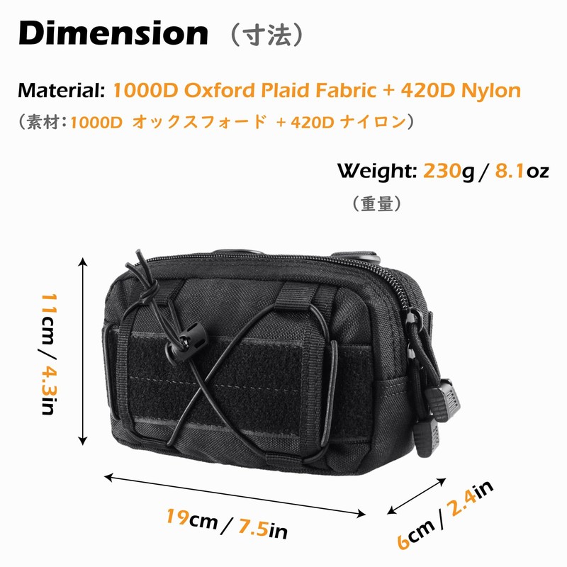• Specifications: Material: 1000D Oxford; Dimensions: 7.5 x 2.4 x 4.3 inches (19 x 6 x 11 cm); Weight: 8.1 oz (230 g); Product Name: Tactical Pouch.