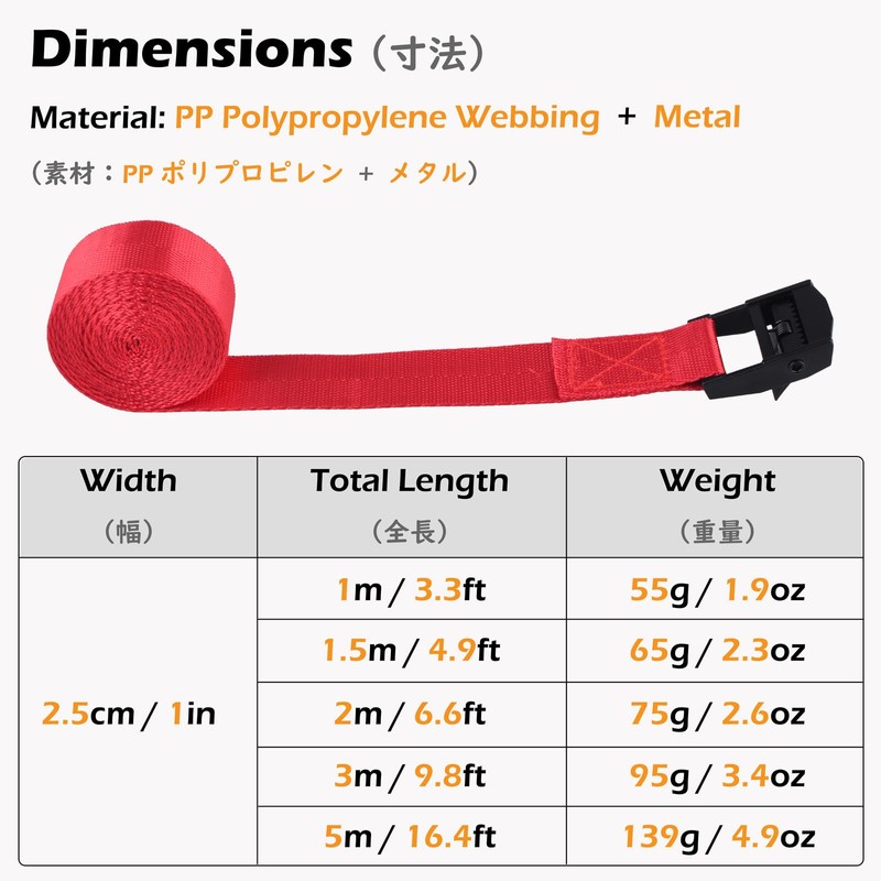 - Size: The size of heavy ratchet strap is 3.3 ft - 16.4 ft (Length)* 1 in (Width) /1 - 5 m * 2.5 cm. Cam starp is ideal for cargo bundling and tightening or used as a trail camera strap