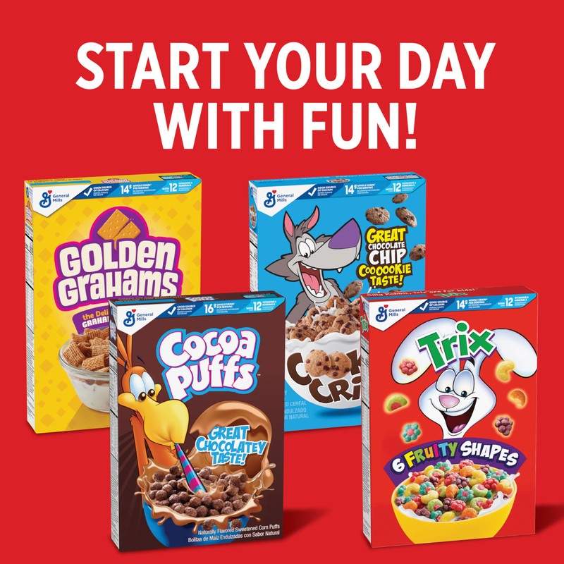 Trix breakfast cereal brings flavorful fun to your family's morning! The naturally and artificially fruit flavored sweetened corn puffs feature six fruity shapes bursting with the fruity taste kids love. Each serving of Trix cereal provides 14g whole grain (at least 48g recommended daily), and has a good source of calcium, with 12 vitamins and minerals. What a great way for your family to start their day. A quick and easy win for kids, reach for Trix or Cocoa Puffs as part of a breakfast, a tasty after school snack, or an anytime treat. Pour a portion into a sandwich bag to take with you on the go or on your next family adventure. Toss some cereal pieces into cereal bars recipes. Use some as a yummy and colorful ice cream topping. However you enjoy the taste, General Mills cereals spread goodness from tots to grown-ups. Contains one cardboard box of crunchy Trix Fruity Breakfast Cereal, Six Fruity Shapes, Whole Grain Corn Puffs, Family Size, 16.1 oz; Perfect for instant snacking, or a part of breakfast and meals.
