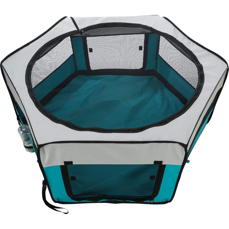 Trixie's Soft Sided Mobile Play Pen is made of extra-durable nylon ideal for indoor and outdoor use. When used indoors, the Play Pen is a great solution for protecting cables, carpets and furniture from the animal's natural chewing instincts. When used outside, the bottom has a rubber coating and metal rim around the bottom to help keep it dry and clean. The bottom can even be removed so that pets are free to play on the lawn. Either way, the play pen can be secured to the ground with straps and ground anchors (included). Additional features include a removable net cover to prevent pets from jumping out, two side pockets and opening for a drinking bottle. When not in use, the crate is fully collapsible and folds down flat for easy storage in zippered storage bag with straps (included). Easy to clean. Simply wipe away any messes with a damp cloth. The removable net and nylon bottom are hand washable. Suitable for puppies, rabbits and guinea pigs. Quick and easy assembly. One year warranty. Color: blue/gray. Dimensions: 51 x 51 x 22 Inch. Weight: 8 lbs.
