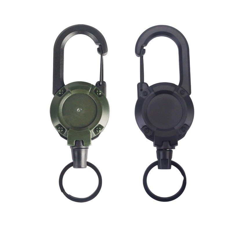 - 【製品仕様】リールキーホルダー2個セット。カラー:ブラックとミリタリーグリーン。サイズ:12.5×4 cm、内太伸縮ワイヤロープ長さ:60 cm、直径:1 mm。