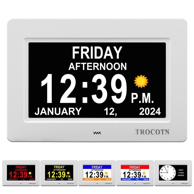 TROCOTN【Newest Dementia Clock Large Digital Clock for Seniors, Calendar Clock Large Display with Custom Alarms,Wall Clock with Day & Date, Alarm Clock,Desk Clock (7 inch White)