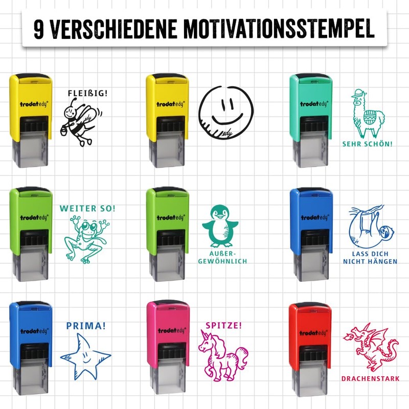 • Motivational stamp for children - With the Trodat edy, we support dedicated primary school, preschool and special educators to motivate school children with the help of the loving and animating motifs