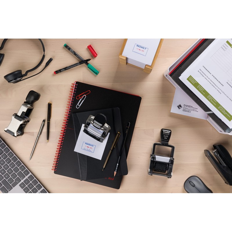 - Original Trodat components: text plates manufactured using high-resolution laser engraving always guarantee even colour application and sharp print quality, stamp made of brushed stainless steel for intensive, permanent use gives thousands of precise and clean prints thanks to vibration-free mechanism