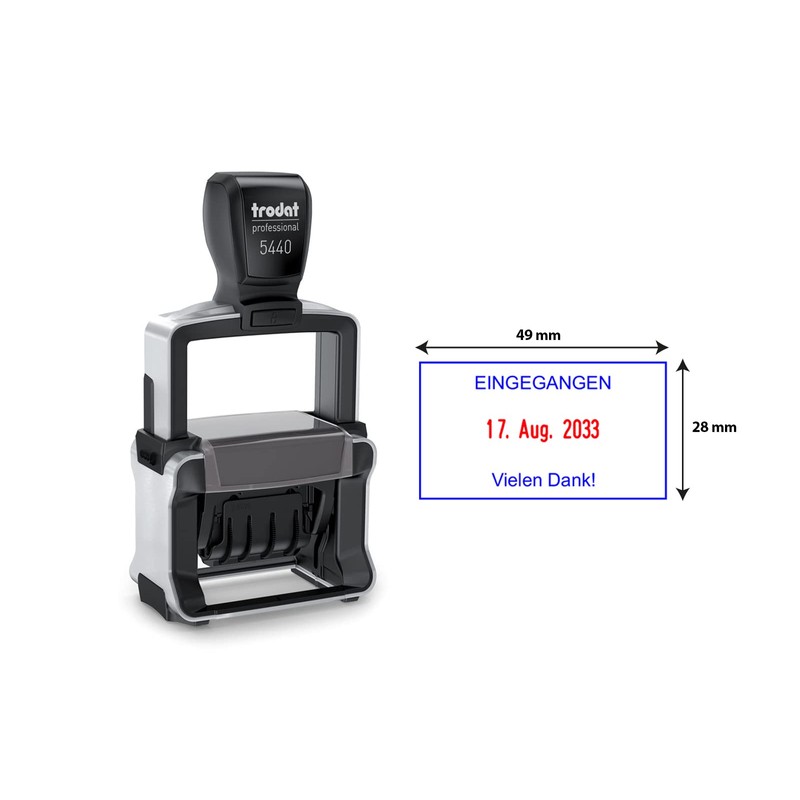 Trodat Professional Date Stamp 5440 - Stamp Personalised with Date and Desired Text, Self-Inking, 4 Lines, 49 x 28 mm, Blue and Red Print