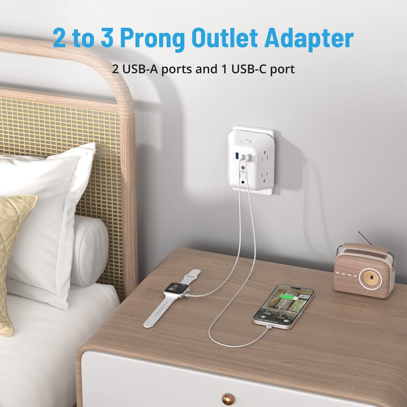 • 2 Prong to 3 Prong Outlet Adapter: The 3 prong to 2 prong adapter that converts a polarized 2 prong outlet to 3 prong outlet, is equipped with 5 AC outlets, 2 USB-A Ports and 1 USB-C Port, which allows you to charge your multiple devices simultaneously, suitable for the bedroom, hotel, kitchen or the non-grounded outlets in older house
