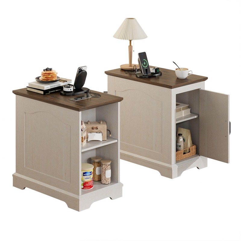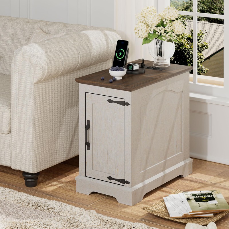 TRONLEE Narrow End Table with Storage, Farmhouse Side Table with Power Outlets & USB Ports, Small Night Stand for Living Room, for Bedroom, Living Room (Wood Door, White & Espresso)