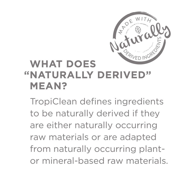 - MADE WITH NATURALLY DERIVED INGREDIENTS – TropiClean defines ingredients to be naturally derived if they are either naturally-occurring raw materials or are adapted from naturally-occurring plant or mineral based raw materials.