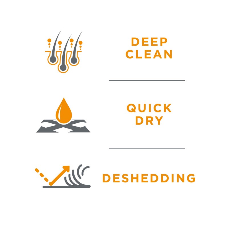 - DESHEDDING – Gently exfoliates skin and loosens undercoat to reduce excess shedding while strengthening the hair follicle