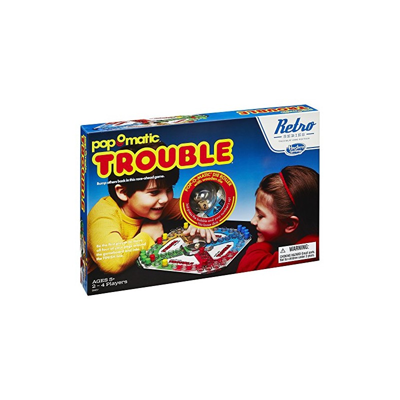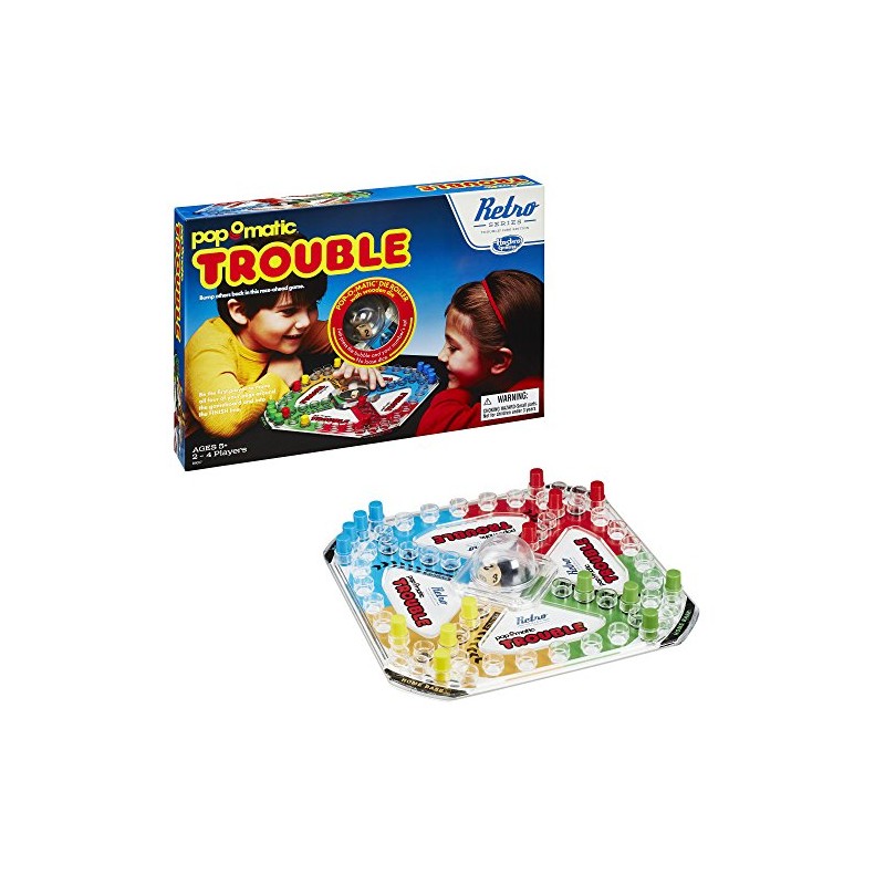 With the iconic Pop-O-Matic die roller and the classic gameboard, this retro edition of the popular Trouble game will bring back happy memories. Players race to get their pegs around the board first, and try to send their opponents’ pegs back to the Start space. With the fun Pop-O-Matic die, players just press the bubble and the number comes up…no loose dice! The first player to move all 4 of his or her pegs around the gameboard and into the Finish line wins. Hasbro Gaming and all related terms are trademarks of Hasbro.