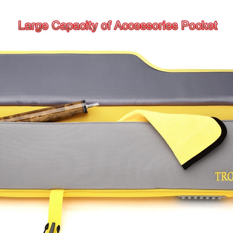 - High Capacity:The cue case can be placed 4 Shafts and 4 Butts,2 outer pockets can store little billiard accessories.Unlock the buckle of the case,open the cover,the inner long pocket can be put jump cue butt and extension and accessories etc.