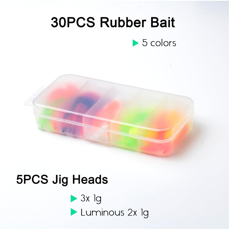- Bait set: fishing set consisting of 30 rubber fish (5 colours), 5 jig heads (3 x 1 g, UV-active 2 x 1 g). The length of the lure is 5.4 cm and the weight is 1.2 g.