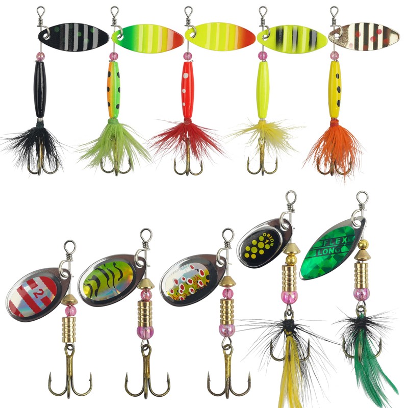 • SPINNER FISHING LURES SET: The 10pcs fishing lures set includes weight about 0.12oz~0.28oz, length about 2.36"~3.03", 4 different styles for choice; Each Spinnerbait comes with a sharp treble hooks with brightly colored strike-attractor sleeves, help it stay high hardness and ultra sharp