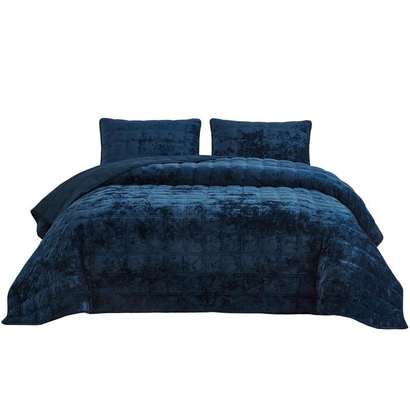 - 3 Piece Plush Silky Soft Smooth Hand-Feel Velvet Quilt Queen Size Double Box Stitch Pattern | Reversible All Seasons Navy blue Color Aesthetic Bedding Luxury Lightweight Bedspread Coverlet Set