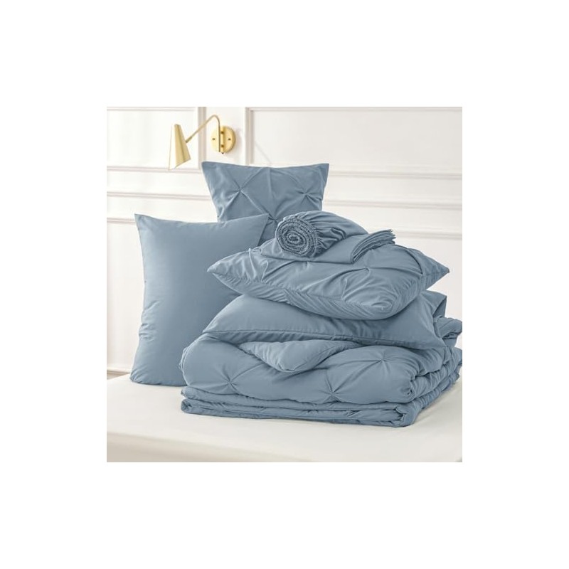 - 7 Piece Bed in Bag All Seasons Fluffy Comforter Set Full Size | Pretty Pintuck Pinch Pleat Geometric Pattern Shabby chic Bedding | Light Mineral Blue Color Soft Plush Cozy Feel Farmhouse Look