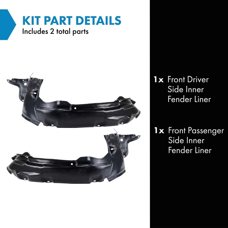 2 Piece Inner Fender Liner SetKit Includes(1) Front Driver Side Inner Fender Liner(1) Front Passenger Side Inner Fender LinerFitmentCompatible with: 2001-04 Ford Escape Front Driver & Passenger SideProduct AttributesQuantity: 2 PieceReference NumbersFord: YL8Z 16102 BA, YL8Z 16103 BA, YL8Z16102BA, YL8Z16103BAPartslink Numbering System: FO1248110, FO1249110