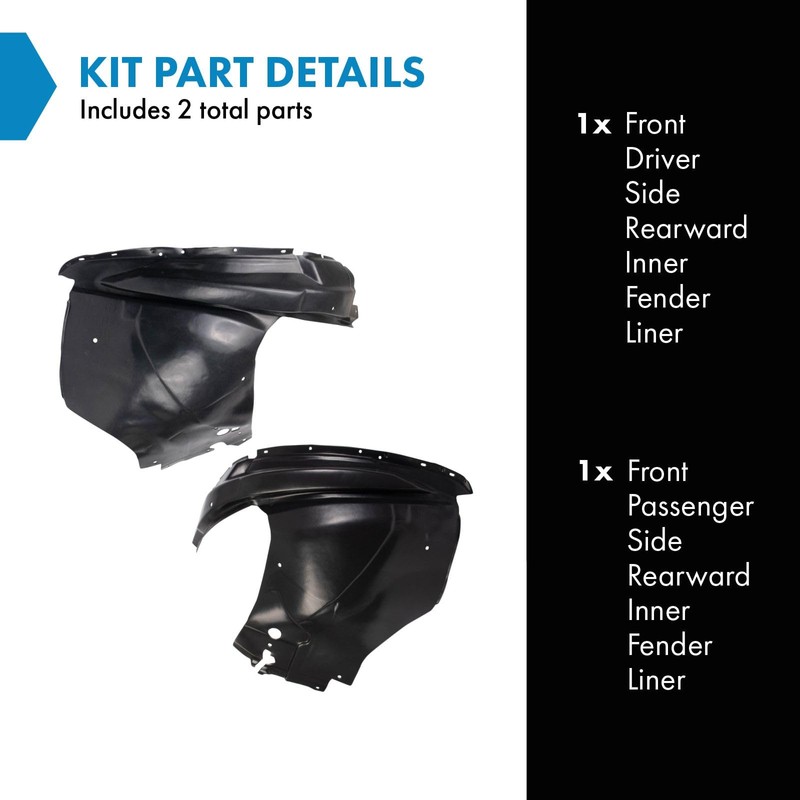 2 Piece Inner Fender Liner SetKit Includes(1) Front Driver Side Rearward Inner Fender Liner(1) Front Passenger Side Rearward Inner Fender LinerFitmentCompatible with: 2008-17 Buick Enclave Front Driver & Passenger Side RearwardProduct AttributesQuantity: 2 PieceReference NumbersBuick: 15280635, 25849001, 25849002Partslink Numbering System: GM1248197, GM1249197