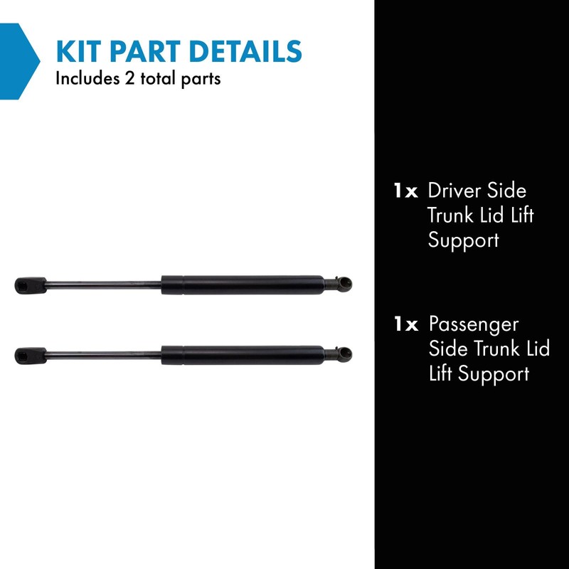 2 Piece Trunk Lid Lift Support SetKit Includes(1) Driver Side Trunk Lid Lift Support(1) Passenger Side Trunk Lid Lift SupportFitmentCompatible with: 2008-09 Chrysler Sebring Sedan Driver & Passenger SideCompatible with: 2007 Chrysler Sebring Driver & Passenger SideProduct AttributesQuantity: 2 PieceReference NumbersChrysler: 5074535ABFCS: 86170Mighty Lift: 95105Sachs: SG414060Strong Arm: 6170Tuff Support: 614056