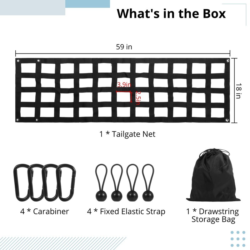 - Wide Vehicle Compatibility: This cargo net is versatile and compatible with a range of truck models. It's compatible with Chevy, Ford, Toyota, Ram, and many others, ensuring universal functionality and offering reliable performance regardless of the vehicle brand.