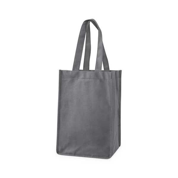- Sewn from sturdy non-woven material, This reusable, Grey wine tote features a reinforced bottom and durable handles. It holds up to four full wine bottles at once, keeping them separated with sewn-in dividers.