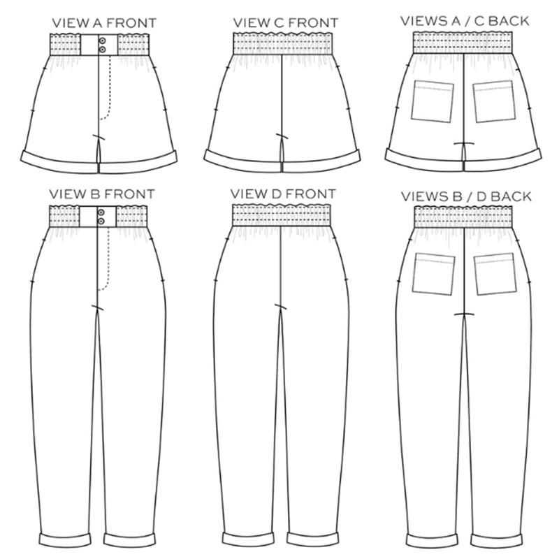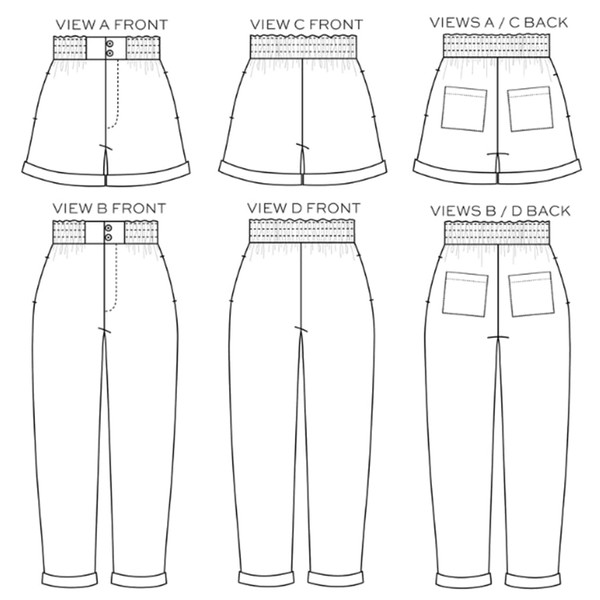 • Views A and B have a zip fly and two buttons at the waist, while Views C and D have a full elastic waistband for an easy pull on fit