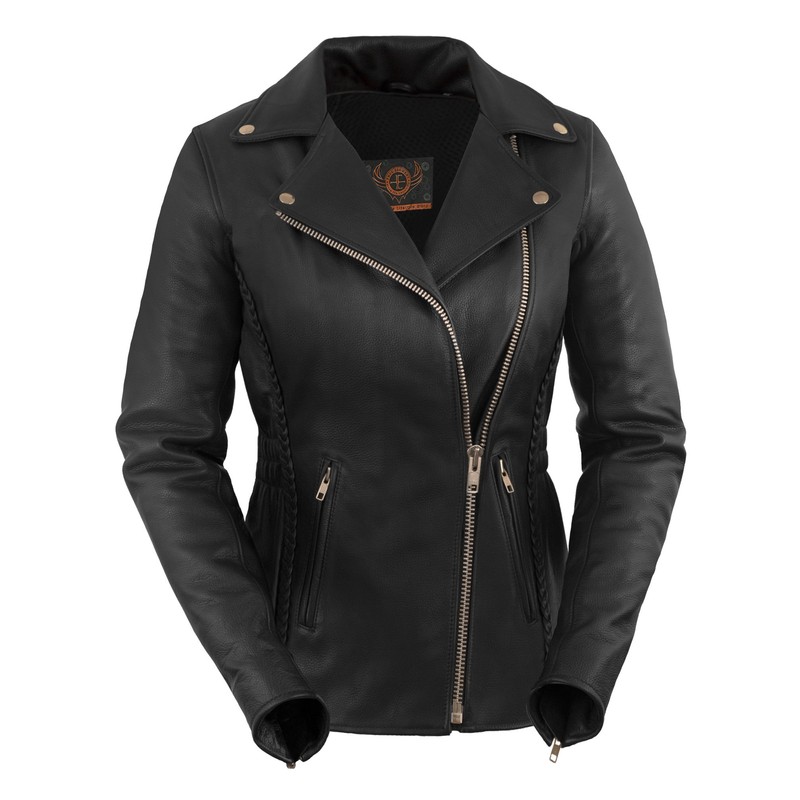 True Element Womens Premium Braided Motorcycle Leather Jacket (Black, Size 2XL)