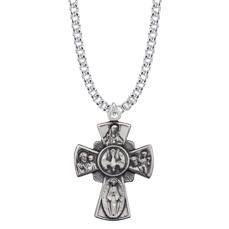 - STERLING SILVER MEDAL – Sterling silver cross pendant. 1 1/4-inch (L) with hand-engraved five-way images.