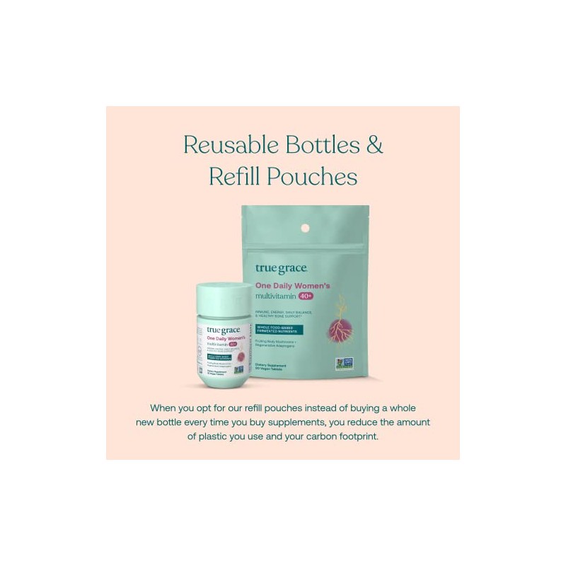 - SUSTAINABLE PACKAGING C Our supplements are delivered in custom-made, reusable bottles made from recycled plastics. We also offer earth-friendly refill pouches made from plant-based materials. Using pouches to refill True Grace bottles minimizes our carbon footprintand yours. Plus, every time you purchase a bottle or pouch of True Grace products, plastic is pulled out of the ocean through our partnership with ReSea Project.