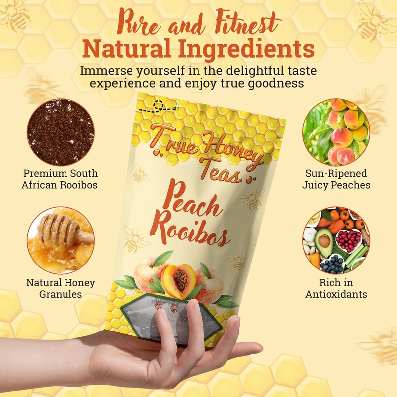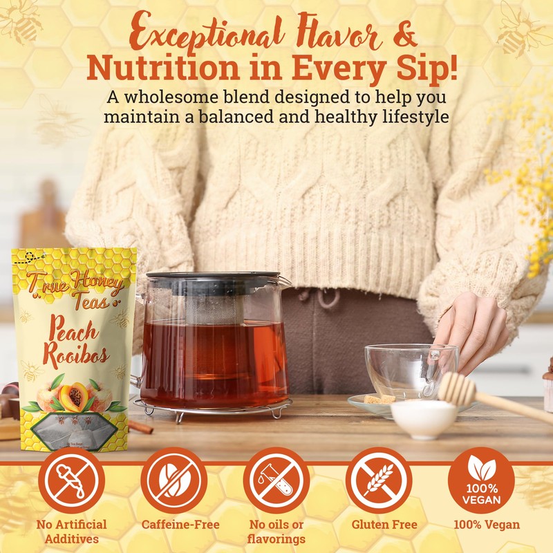 True Honey Teas Peach Rooibos Tea Bags - All Natural Organic Rooibos with Dried Peach Juice - Herbal Caffeine-Free Blended with Honey Crystals - 24 Count