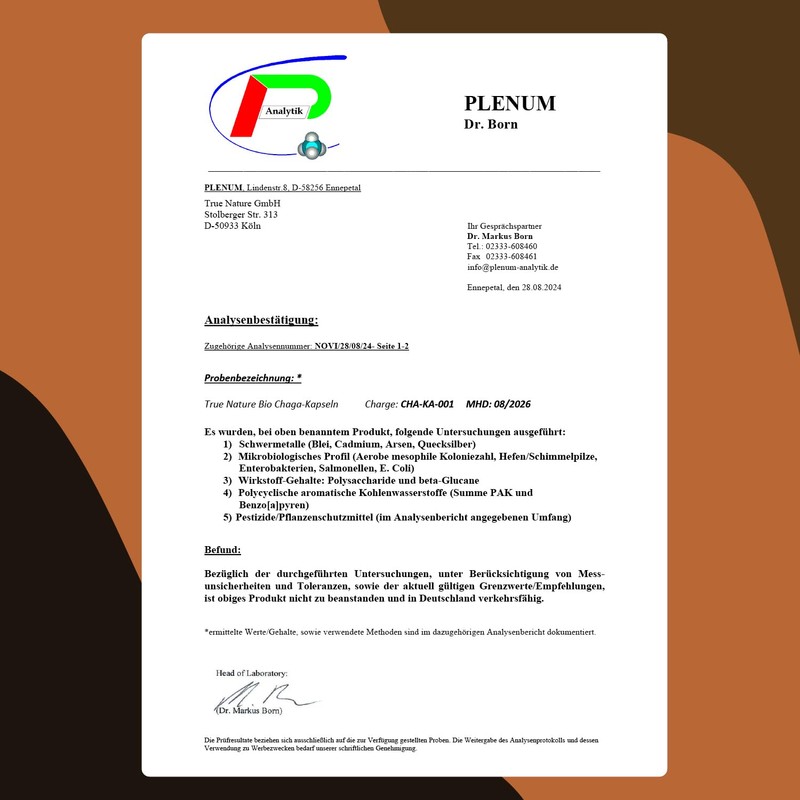 - TRUE INGREDIENTS - Dein Chaga-Pilz (Inonotus obliquus) ist ein Premium-Rohstoff aus China, der unter h?chsten Standards aus dem Fruchtk?rper gewonnen wird. Trotz reinster Verarbeitung vor Ort zertifiziert* (siehe Laborzertifikat/ Analysebest?tigung in den Produktbildern) ein unabh?ngiges deutsches Labor Reinheit und Wirkstoffgehalt jeder Charge. Der Rohstoff wird in Deutschland gem?? ISO- und HACCP-Standards abgefllt.