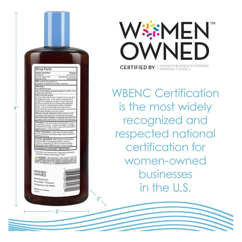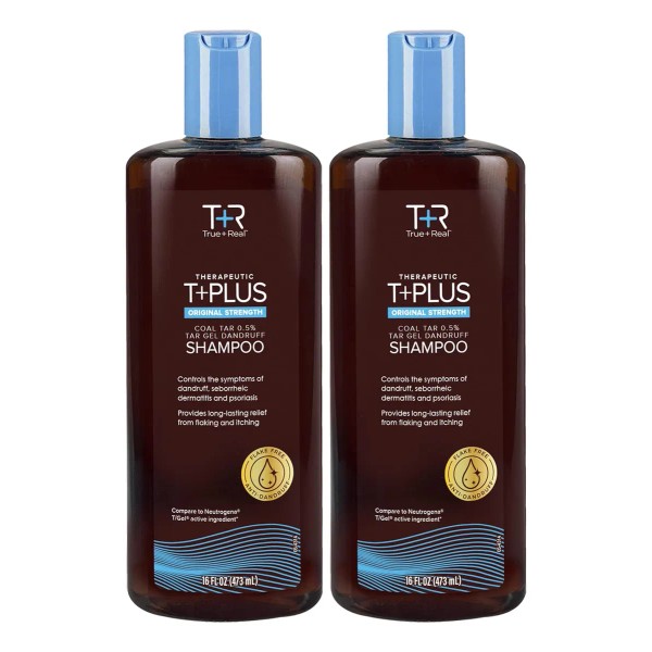 El True+Real Shampoo Terapéutico T-Plus / T-Gel (2 Pack, 473 ml) con extracto de alquitrán de hulla es un champú para el alivio de la caspa, dermatitis seborreica y psoriasis crónica del cuero cabelludo. Se aplica en el cuero cabelludo, se deja actuar y se enjuaga. Se recomienda consultar a un dermatólogo y tener precaución con la exposición solar.