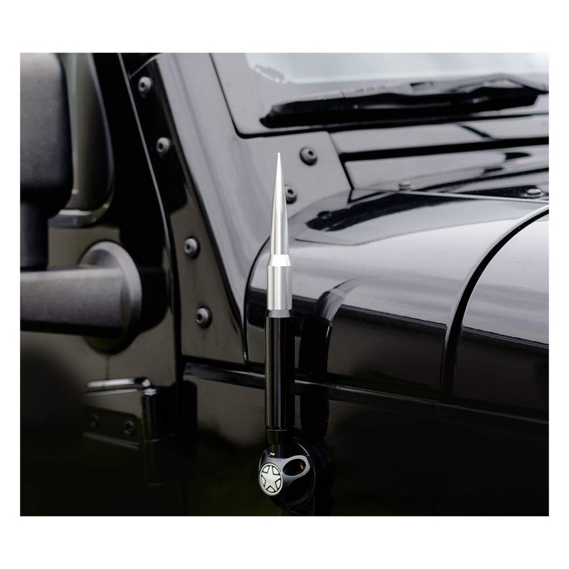 TRUE SPIKE 9 inch BLACK SILVER TIP PENETRATOR FAT BULLET ANTENNA with ANTI-THEFT + COPPER COIL in Heavy Gauge CNC Machined Billet Aluminum Short Compatible with Jeep Wrangler JK JKU JL JLU