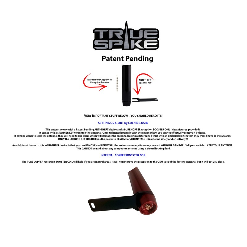 - TWO EXCLUSIVE Patent Pending features! TRUE SPIKE by VMS RACING Brand Antenna feature an EXCLUSIVE Patent Pending ANTI-THEFT Design which includes a special Spanner Key allowing you to tighten the antenna to a point which is almost impossible to remove with your bare hands or any other commonly available tool without damaging the antenna. It also has an EXCLUSIVE Patent Pending ANTENNA BOOSTER COIL that Improves radio signal. Comes in TRUE SPIKE Branded BOX. New / Never Used / Never Installed.
