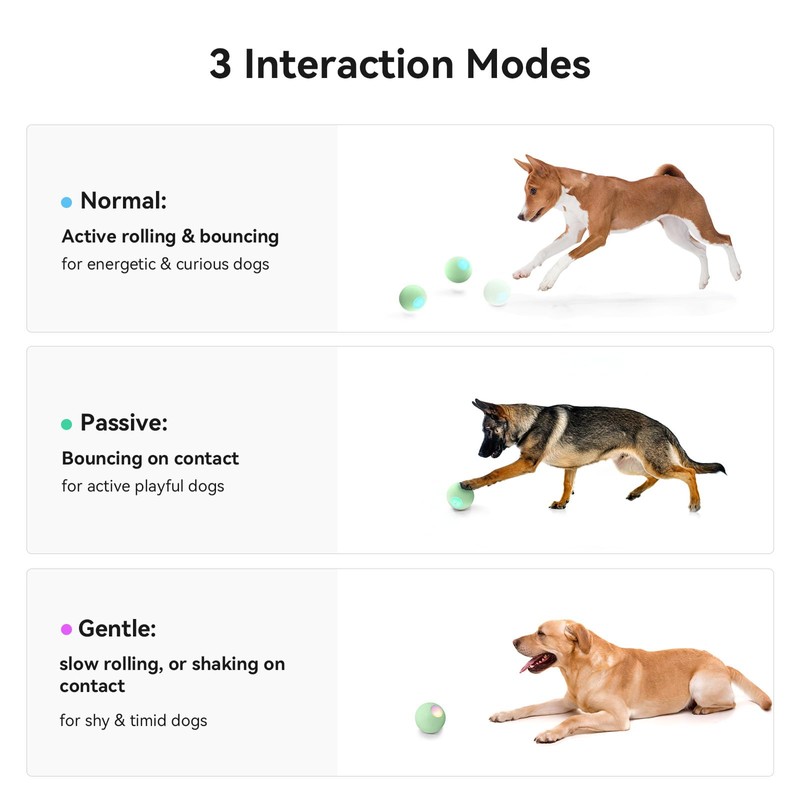 - 3 Interactive Modes: Passive, Normal and Gentle mode. Upon being turned on, it will automatically move, shake or bounce, among which you can switch to fit for different dogs play. The cool LED light will also be turned on to catch your dog's attention immediately. As a mentally stimulating and entertainment toy, it's suitable for indoor and outdoor play, keeping your dog happy and busy.