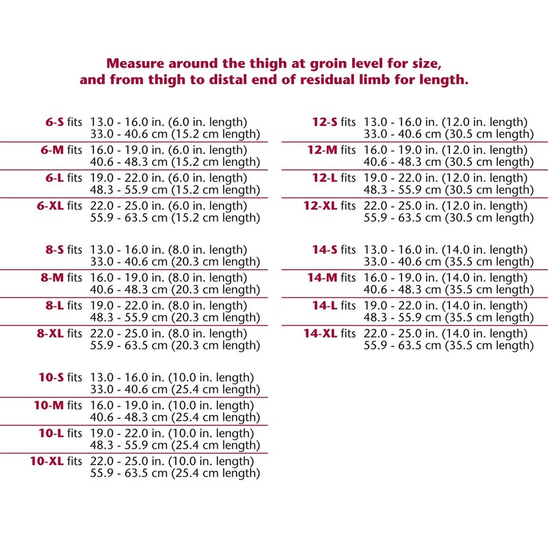 - Sized by circumferences at the distal end of the residual limb and at the upper thigh, and the length of the stump
