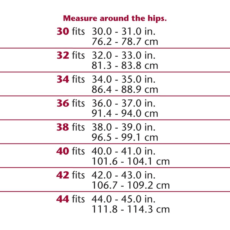 - Measurement should be taken directly on the skin; Available sizes: 30 to 44 inch hips in even increments
