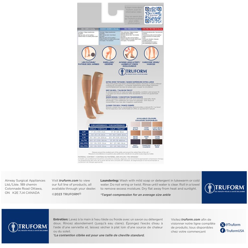 Product DescriptionTruform 1773 from the Truform Lites series provides mild graduated compression to help energize the legs and reduce discomfort. The 15-20 mmHg moderate compression level is great for leg fatigue and slight ankle, leg and foot swelling. They provide long-lasting support that appeals to today's active, fashion conscious woman and serve excellently as both business and casual wear. Truform stockings, socks, and pantyhose feature Graduated Compression Technology, which delivers a compressive action to the leg that is greatest at the ankle, then gradually decreases toward the heart. This graduated compression provides two primary benefits to the legs: increased pressure on tissues beneath the skin helps reduce and prevent swelling for the wearer, and the compression action helps control the size of the superficial veins that lie just beneath the skin, preventing the slowing of blood flow so it can flow more quickly up the leg back toward the heart. Five intervals of therapeutic graduated compression, doctor-recommended to help relieve tired, heavy, and aching legs, aids in the treatment of spider veins, varicose veins, and swelling of the leg and feet, ideal when sitting or standing for long periods of time. We take the extra time and effort necessary to insure a therapeutically effective, comfortable fit. The combination of state-of-the-art materials and equipment, plus knitting know-how sets Truform apart from the crowd to make your legs look and feel great.Manufacturer Contact Information3960 Rosslyn Dr, Cincinnati, OH 45209