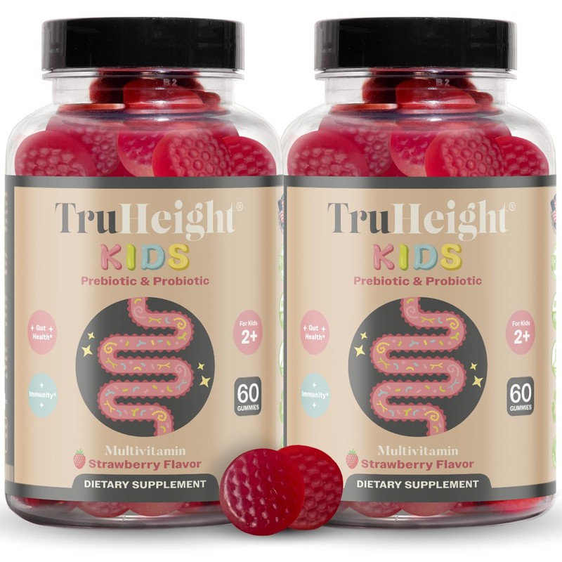 TruHeight Kids Prebiotic & Probiotic Gummies Ages 2+ (Strawberry Flavor) Toddlers & Kids All Natural Supplement for Digestive Health, Gut & Immune Support, Pediatric Recommended Vitamins, Vegan NonGMO