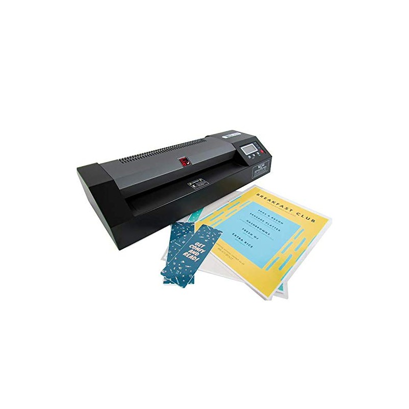 - Back-lit LCD display screen, temperature selection buttons, and a built-in reverse button to easily remove jams, and a dual-fan cooling system to reduce curling and produce a superior finish.