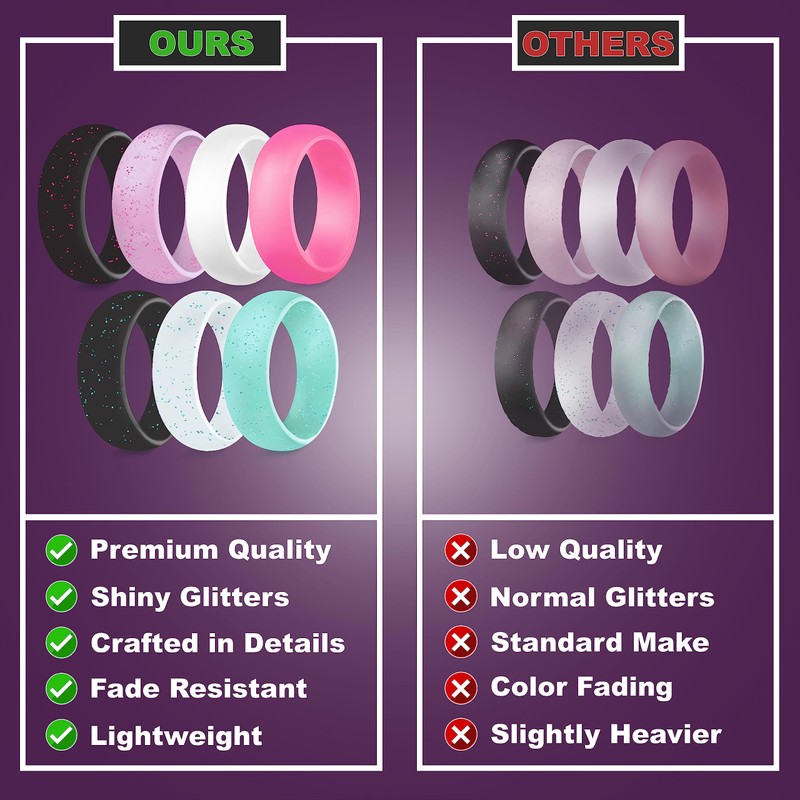 - 💍 COLORFUL, PACK OF 4 GLITTER SILICONE RING WOMEN : Our silicone rings women wedding bands available in a stunning range of hot colors and glitters. Rubber rings women are designed to complement your individual style, giving you the freedom to express yourself.