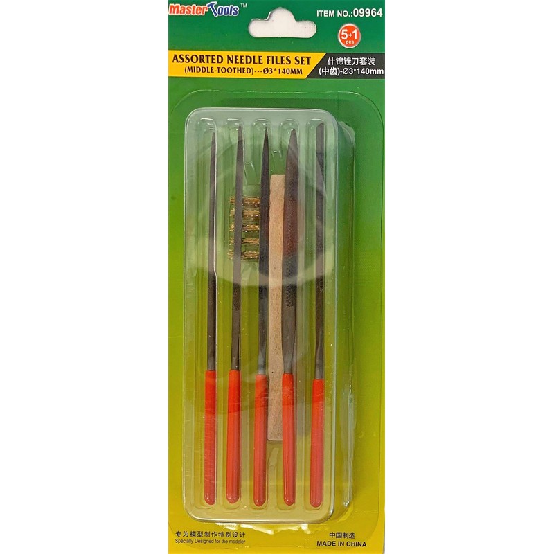 • Tools: File set in the shapes rectangular, square, domed, triangular and round. Includes a small wire brush for cleaning. Medium Teeth