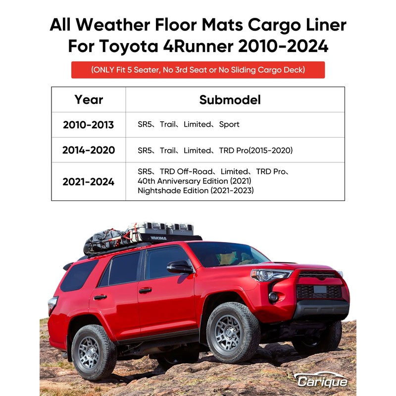 - All-Weather Rubber Cargo Liner for 2010-2025 Toyota 4Runner: Engineered with heavy-duty sturdy rubber, this trunk mat fits 5th Gen 4Runner Trail, TRD, and Limited trims (2010-2025). Defend against mud, snow, and spills while maintaining a sleek OEM style look(Fit 5-Seat No 3rd Row Seat/Sliding Cargo Deck)