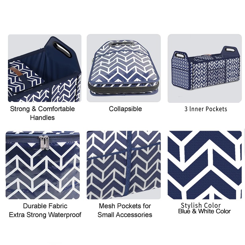- Practical Design for Storage - You can easily organize your car trunk stuff with its practical design for storage. It is 24.8 X 11.4 X 9.8 Inches with 3 compartments. Each compartment has ample storage space, each of them can be folded to make the bag smaller. There are two pockets in the both side of bag, two mesh pockets in the front and back. Pockets prevent tiny items from sliding and mesh pockets allow you to see what you have put in it. Navy blue and white pattern looks unique and stylish.
