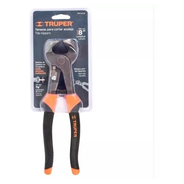 Tenazas para cortar azulejo Truper de 8 pulgadas (20 cm), útiles para hacer incisiones curvas o rectas durante trabajos de construcción. Poseen dientes de carburo de tungsteno para máxima duración, con una capacidad de corte de 3/8 de pulgada (9.5 mm). Su estructura cuenta con mangos antiderrapantes para un agarre cómodo y seguro en el uso. Sus dimensiones son 20 x 6.5 x 2.5 cm.