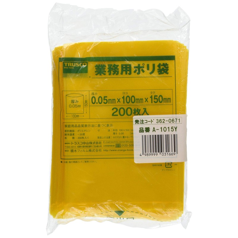 TRUSCO(トラスコ) 小型ポリ袋 縦150×横100×t0.05 黄 200枚入 A-1015Y