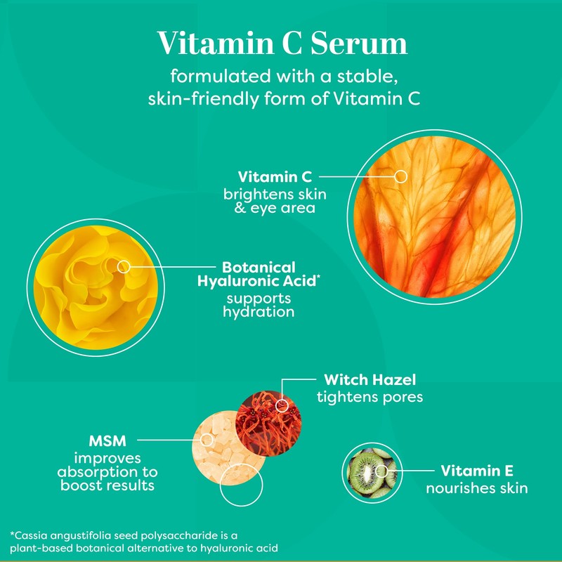- Start your day off right: Our Vitamin C serum for face blends Vitamin C with Hyaluronic Acid and MSM; this serum helps even skin tone, neutralize free radicals and boost collagen to improve radiance and reduce dark spots, fine lines and wrinkles