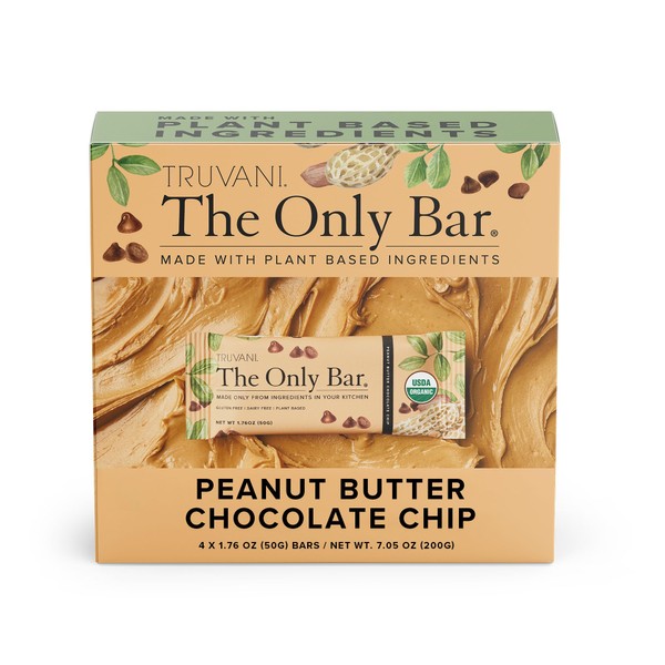 Truvani Plant Based Snack Bars | Peanut Butter Chocolate Chip 4 Pack | 8g Protein | USDA Organic and Vegan | The Only Bar | Dairy, Soy, and Gluten Free | Individually Wrapped