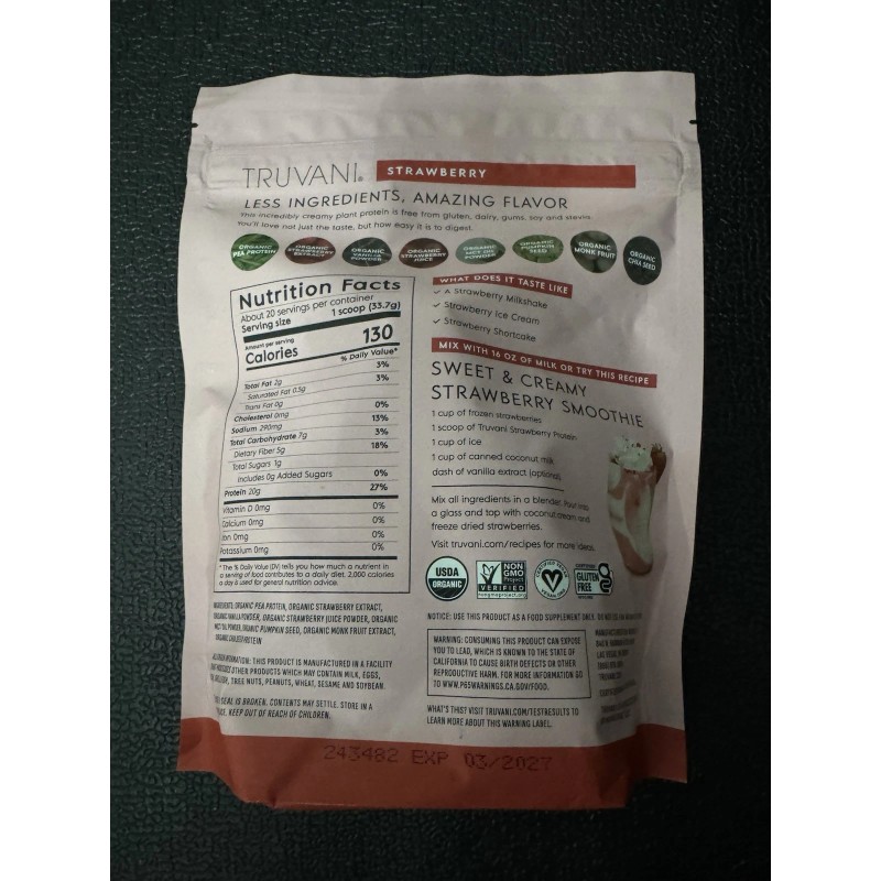 Truvani Plant Protein Powder Mix Strawberry Flavor, 20 Servings Exp 03/27